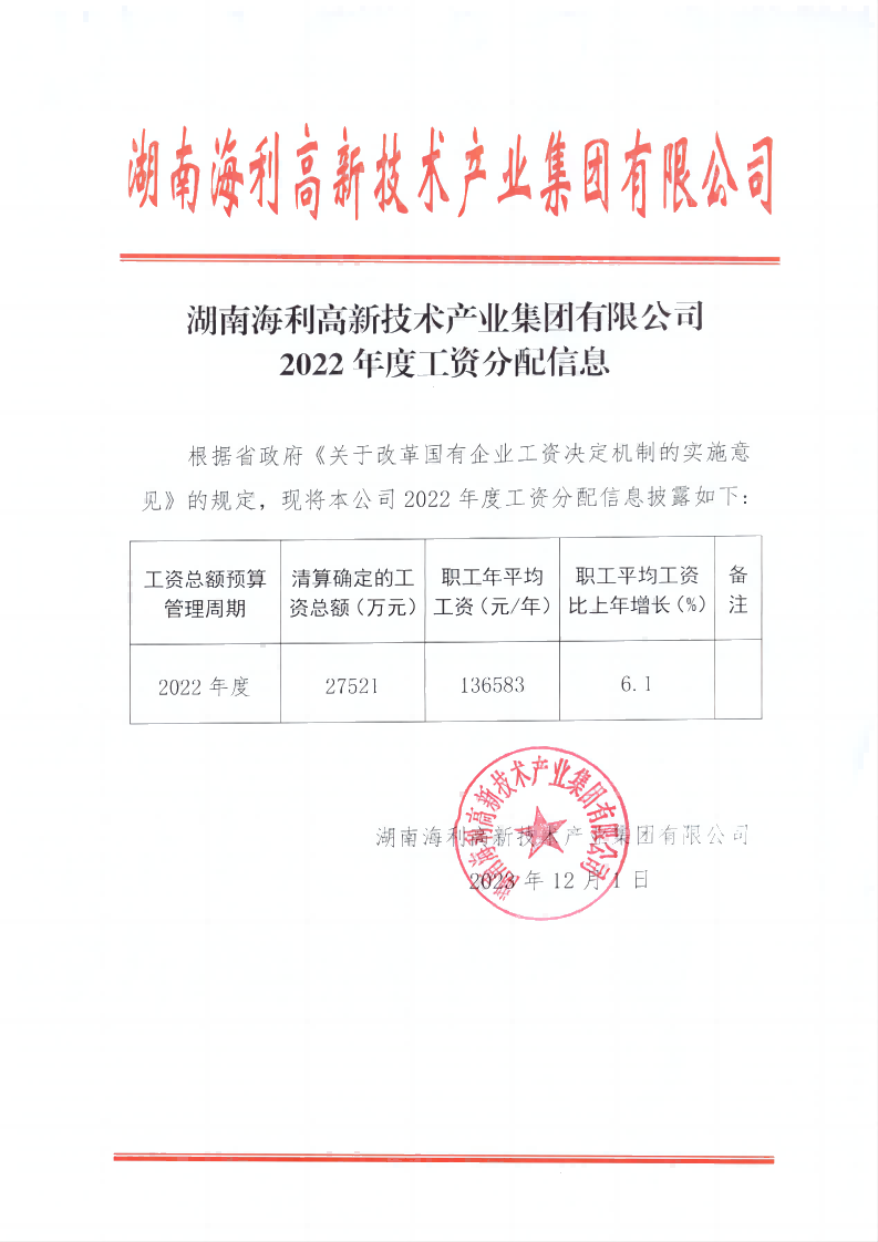 湖南海利高新技術(shù)產(chǎn)業(yè)集團(tuán)有限公司2022年度工資分配信息