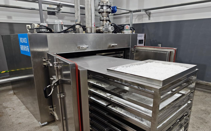 此次共投入810公斤銀板,經(jīng)過(guò)溶銀、除雜、中和、結(jié)晶、烘干等一系列流程后,一盤(pán)盤(pán)雪白的、亮晶晶的成品展現(xiàn)在大家眼前。