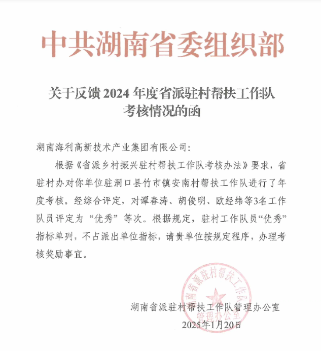 近日,從省派駐村幫扶工作隊(duì)管理辦公室獲悉,集團(tuán)駐洞口縣安南村幫扶工作隊(duì)2024年度以全優(yōu)佳績(jī)?yōu)猷l(xiāng)村振興工作交上滿意答卷:工作隊(duì)考核“好”等次,譚春濤、胡俊明、歐經(jīng)緯3名工作隊(duì)員考核“優(yōu)秀”等次。