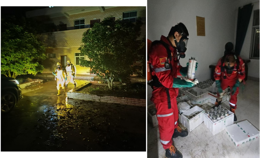海利集團(tuán)救援隊(duì)于19日20時(shí)抵達(dá)現(xiàn)場后,全體隊(duì)員未作休整即刻投入救援。在快速完成化學(xué)防護(hù)服穿戴及空氣呼吸器佩戴的同時(shí),同步核查糧庫物資存儲信息。完成準(zhǔn)備工作后,救援組立即進(jìn)入倉庫展開分工協(xié)作,對庫區(qū)空氣實(shí)施系統(tǒng)化檢測與偵查。經(jīng)全面排查潛在風(fēng)險(xiǎn)點(diǎn),確認(rèn)除磷化鋁瓶體表面存在大量淤泥附著外,其包裝內(nèi)部未發(fā)現(xiàn)進(jìn)水跡象。