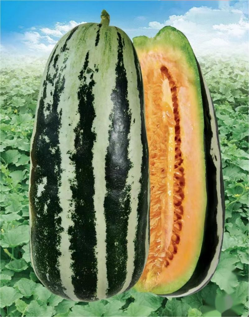 該品種為湖南省蔬菜研究所新育成的早熟甜瓜品種。春季全生育期85天左右,花后27天即可采收;秋季全生育期68天左右,花后24天即可采收。果實筒形,果皮灰白色覆墨綠色條帶,果肉桔紅色,肉質(zhì)香脆,口感嫩爽,風味佳。果肉可溶性固形物含量16-18%,單瓜重500-600克,果肉厚2.2厘米左右。植株生長健壯,耐濕抗病,耐糖心,適應性強,易栽培,座果性好。